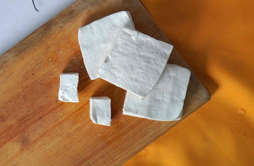 1. Tahu ditutup dengan tisu, kemudian ditaruh loyang di atas tahu dan tindih dengan benda berat seperti mangkuk. Biarkan selama 30 menit.