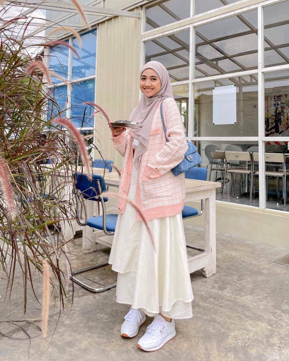 3. Layering outfit dan Korean style merupakan dua hal yang sulit dipisahkan. Sama halnya pilihan Richa mengenakan kardigan pink motif plaid, rok layer broken white, dan hijab light purple