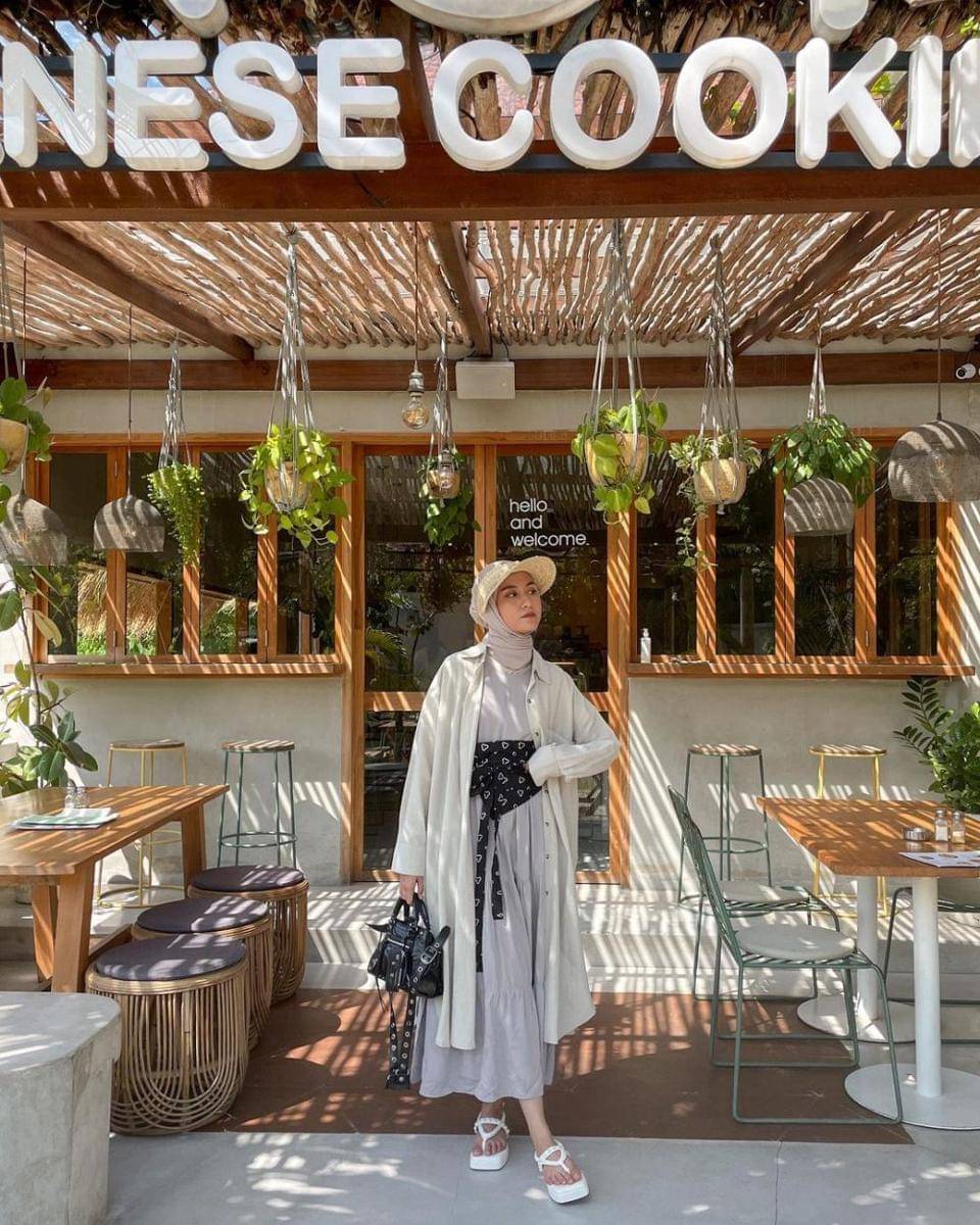 5. Liburan juga harus tetap stylish dong. Gunakan dress warna grey, long shirt outer ivory, dan obi belt bikin look kamu terlihat memukau