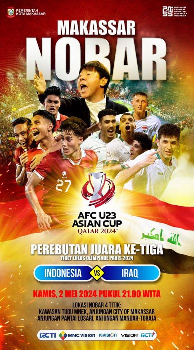 Makassar, IDN Times - Pemerintah Kota Makassar menyediakan tempat nonton bareng (nobar) laga Timnas Indonesia Vs Irak dalam pertandingan terakhir perebutan juara 3 AFC Asian Cup Qatar 2024, Kamis (2/5/2024).